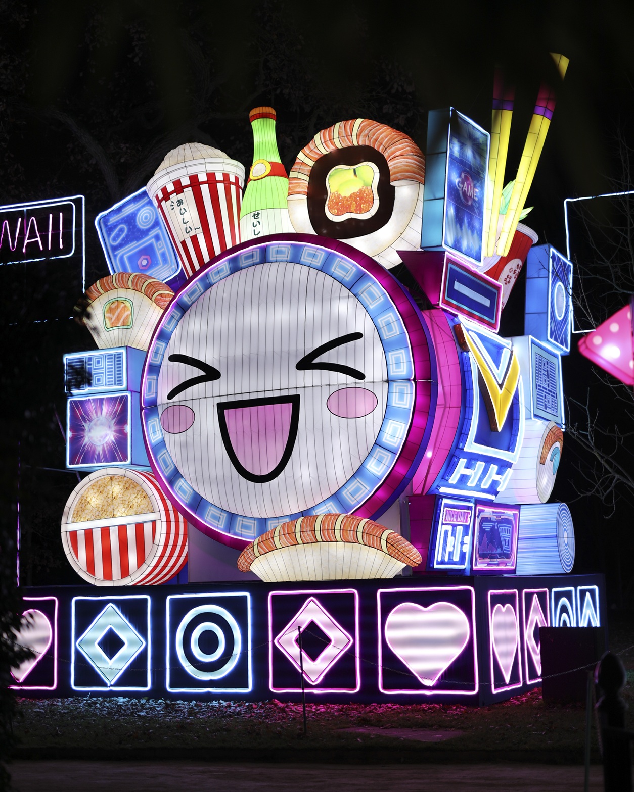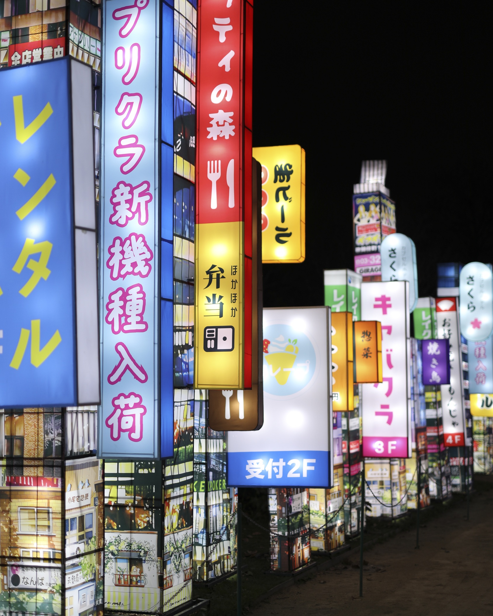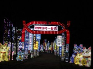 contemporain, des mangas et des personnages emblématiques de la culture kawaii, dans une explosion de façades urbaines barrées de néons et de fantaisie débridée.
