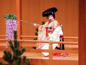 Pour cette découverte de l’art de l’onnagata, le jeune et talentueux acteur de kabuki Nakamura Takanosuke dévoilera sur scène comment il se maquille et revêt son costume, avant d’interpréter un extrait de Fuji-musume (La jeune fille à la glycine), un classique des danses nagauta-buyô. Dans cette pièce emblématique de la danse traditionnelle japonaise, l’esprit d’une fleur de glycine apparaît sous la forme d’une jeune fille et exprime son amour pour un homme à travers de somptueux costumes et des danses gracieuses. Son changement de costume en un clin d’œil est l’un des moments forts de cette pièce.