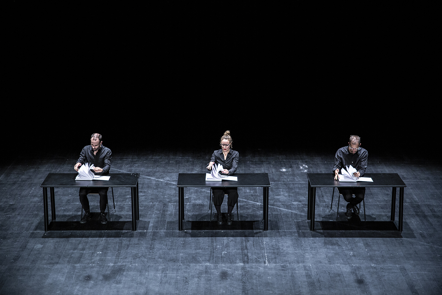 Réduisant la fracture avec les arts plastiques, noir et blanc, couleurs, images ou mouvements, Ryoji Ikeda reconsidère les canons de l’écriture musicale dans des architectures minimalistes insaisissables, voire chaotiques. En duo, en trio ou en quatuor, utilisant comme percussion le corps propre de l’interprète, quelques instruments métalliques ou toutes sortes d’objets, hétéroclites et incongrus, les miniatures de music for percussion sont une mise à nu artistique et magnifient la tension entre un visuel épuré et un matériau sonore aux riches entrelacs rythmiques. Des motifs agiles, des processus inéluctables ou des mécanismes d’horlogerie subtile se déploient sur une scène géométrique. Il en est de même, en duo ou en nonette, dans music for strings, avec ses symétries : deux musiciens y lisent, l’un à l’endroit, l’autre à l’envers, une partition disposée sur une table longue et étroite, marchent et se croisent au milieu ; ensuite, neuf interprètes sont placés sur une même ligne, qui exalte chacun de leurs mouvements.